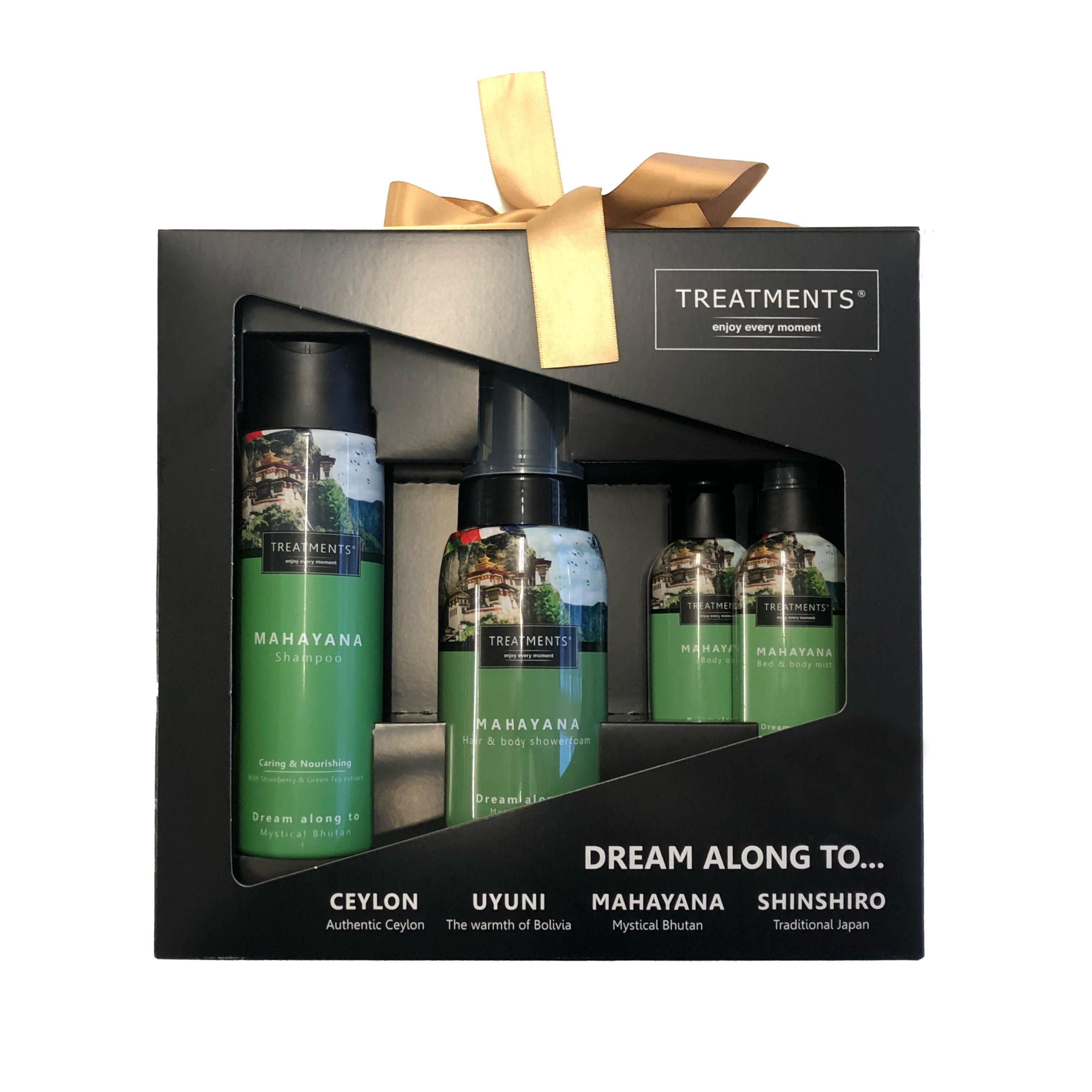 Relaksująca chwila wellness zaczyna się od Giftbox Relax w słodkim, wiosennym zapachu Mahayana. Oczyść włosy szamponem i jednocześnie zadbaj o skórę głowy. Pianka pod prysznic do włosów i ciała oczyszcza skórę, cieszy się lekką konsystencją na skórze, ale nadaje się również do włosów. Olejek do ciała zmiękcza, odżywia i chroni skórę. Zakończ swoją rutynę z tym pudełkiem odświeżającą mgiełką Bed & Body Mist, upewniając się, że zarówno skóra, jak i tekstylia noszą Twój ulubiony zapach.Otul się zachwycającym połączeniem zapachu Mahayana, słodkiego, wiosennego zapachu emanującego z liliowych hiacyntów i pikantnych nut piżma i drzewa sandałowego i śnij o mistycznych tradycjach z niezwykłego Bhutanu.