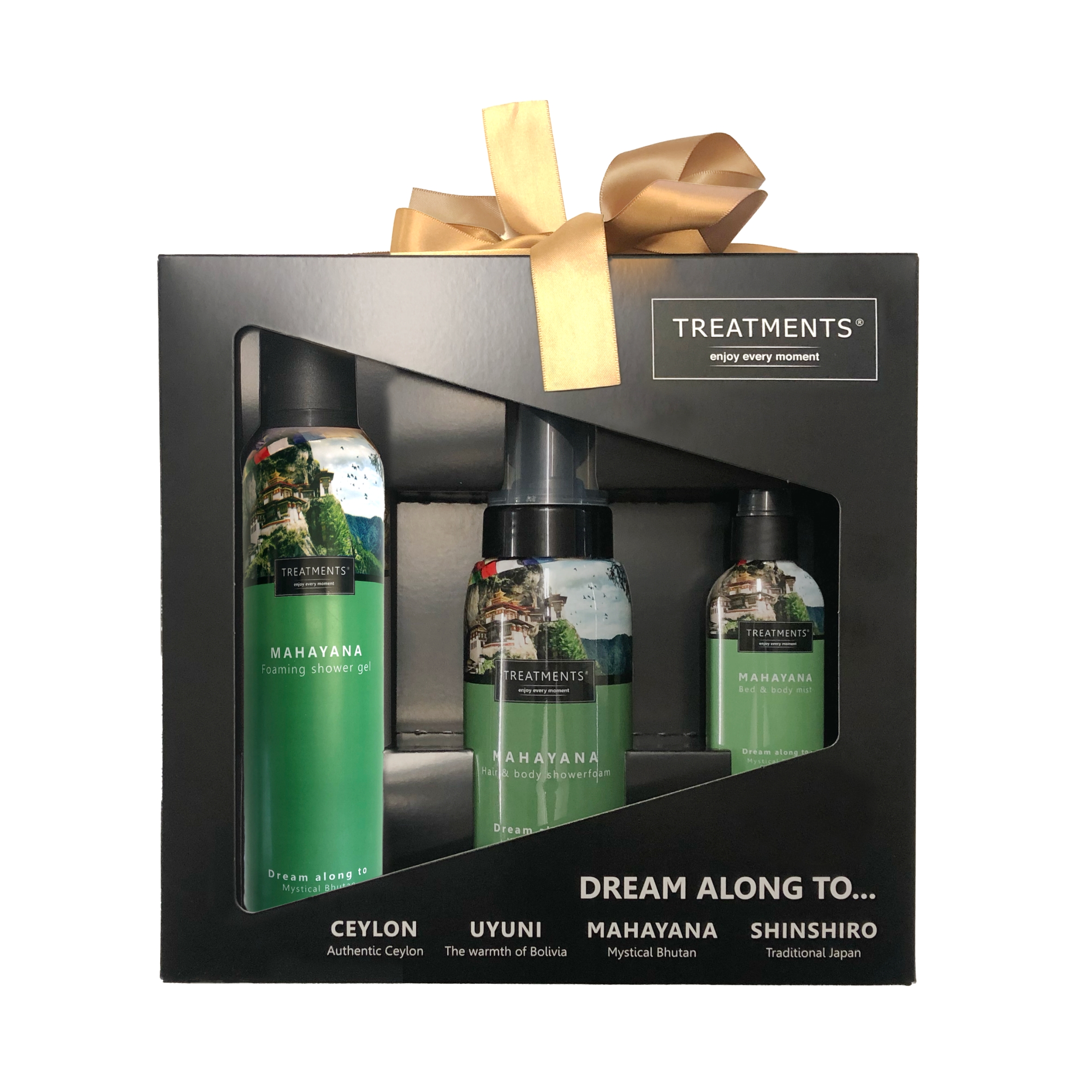 Ten kompletny zestaw upominkowy zawiera kremową piankę pod prysznic do włosów i ciała, która zapewnia cudownie luksusowe uczucie na skórze, kojący szampon, który delikatnie oczyszcza i pielęgnuje zarówno włosy, jak i skórę głowy, a na koniec orzeźwiającą mgiełkę do łóżka i ciała, która pozwala otulić siebie i otaczające Cię osoby zachwycającym zapachem Mahayana za pomocą zaledwie kilku rozpyleń. Odkryj, jak zapach liliowych hiacyntów i pikantne nuty piżma i drzewa sandałowego odzwierciedlają słodki, wiosenny zapach z wyjątkowego Bhutanu.Uwolnij się, ciesz się płynącą po skórze wodą, śnij o mistycznych zwyczajach wellness Bhutanu i naładuj się nową energią. Nasze pudełko Revive Giftbox jest nie tylko pięknie zaprojektowane, ale przede wszystkim jest idealne na chwilę ożywienia” dla siebie lub kogoś innego”.